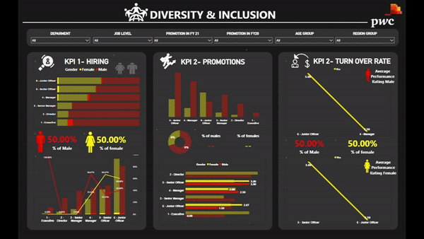 Human Resources at our telecom client is highly into diversity and inclusion. They’ve been working hard to improve gender balance at the executive management level, but they’re not seeing any progress. They’re reaching out to us for help.At PwC Switzerland we are often approached by clients seeking support with diversity and inclusion. Companies need a workforce of diverse talents and backgrounds to succeed in an increasingly complex and heterogeneous world. To us, diversity and inclusion are business imperatives, not just nice-to-haves. We aim for all of our teams to feel welcome and appreciated. But actually achieving this and unlocking its potential involves a whole set of practical challenges.1.Define relevant KPIs in hiring, promotion, performance and turnover, and create a visualisation